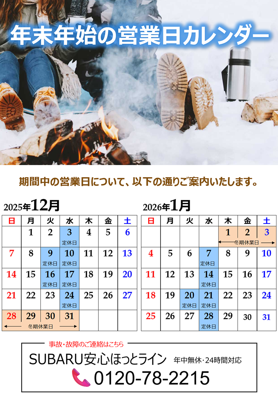 休業中、お車の事故や故障でお困りの際は、SUBARU安心ほっとラインへご連絡をお願いいたします。