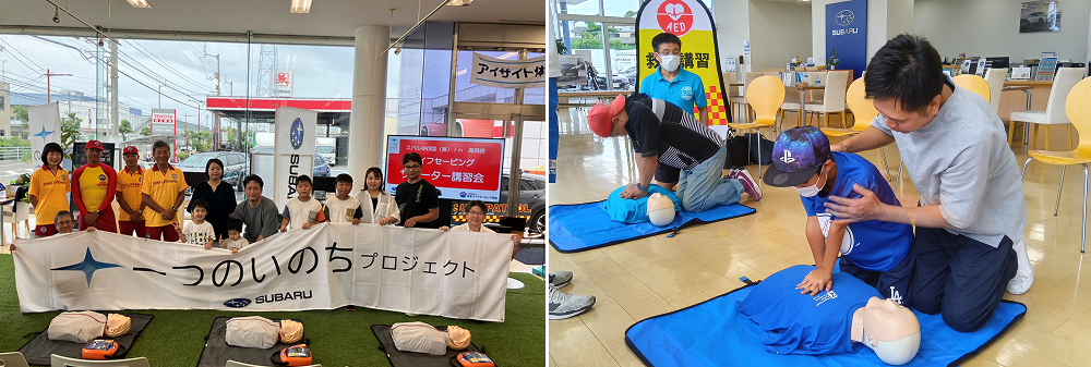 スバル中四国(株)では、「一つのいのちプロジェクト」の活動としてライフセーバーカーの提供をはじめ、中四国エリアのライフセーバーをサポートしております。今回は、「いのちを守る」ために活動されるライフセーバーについて知っていただきたいとの思いで、8月2日~10日の期間中、スバル中四国の7つの店舗でライフセービングサポーター講習会(BLS講習・一次救命処置)を開催いたしました。 普段なかなか接することが無い現役ライフセーバーの皆さんから救命時の基本となる「胸骨圧迫」と「AEDの使用法」についてレクチャーを受けました。当日の様子をご紹介いたします。
